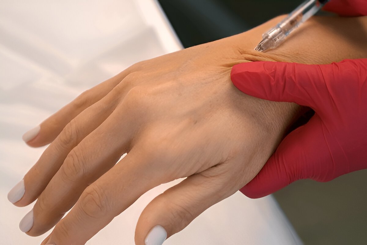 Hand filler treatment uses hyaluronic acid dermal filler to rejuvenate and plump the hands, improving texture and hiding visible veins and tendons.